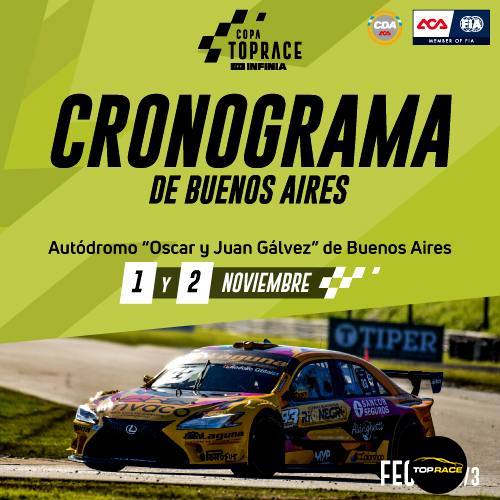 El 1 y 2 de noviembre se pondrá en marcha la Copa Top Race YPF INFINIA en el circuito 8 del Autódromo “Oscar y Juan Gálvez” de Buenos Aires, junto a la 8º fecha del Campeonato Argentino de Fórmula Nacional y el 9º capítulo del año de la Fiat Competizione con horarios confirmados.