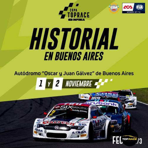 Este 1 y 2 de noviembre inicia la Copa Top Race YPF INFINIA en el Autódromo “Oscar y Juan Gálvez” de Buenos Aires, junto a la 8º fecha del Campeonato Argentino de Fórmula Nacional y a la 9º fecha de la Fiat Competizione. Para el Top Race será la visita N°21 al circuito N°8 del trazado porteño, donde los máximos ganadores son Diego Aventín y Franco Girolami con 3 triunfos cada uno.